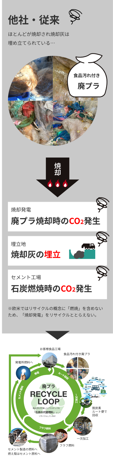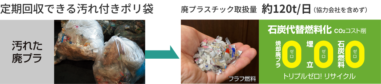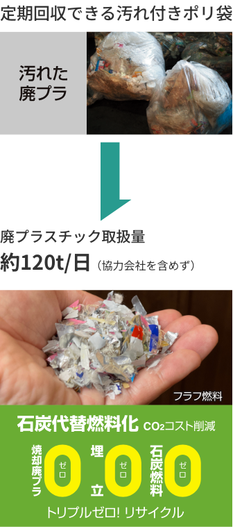 汚れが付着した廃プラスチックを石炭代替燃料(フラフ燃料)としてリサイクルし、セメント原料や発電燃料として活用されています。単純焼却処理に比べて処理費用も安く、温室効果ガス(Co2)の削減にもつながります。カーボンニュートラルに向けた脱炭素社会への実現にも大きく貢献します。