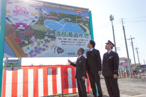 また、柳生駅にて行われた「寄贈看板お披露目式」では渡良瀬遊水地や熱気球など、北川辺地区を象徴するものが描かれた誘導看板をお披露目いたしました。